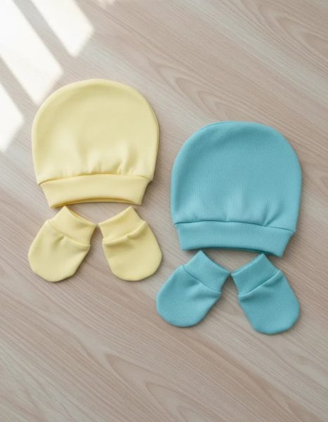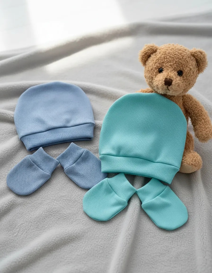 - Kit com 2 conjuntos (touca + luva): proteção completa para recém-nascido, evitando arranhões e mantendo o bebê aquecido desde os primeiros dias