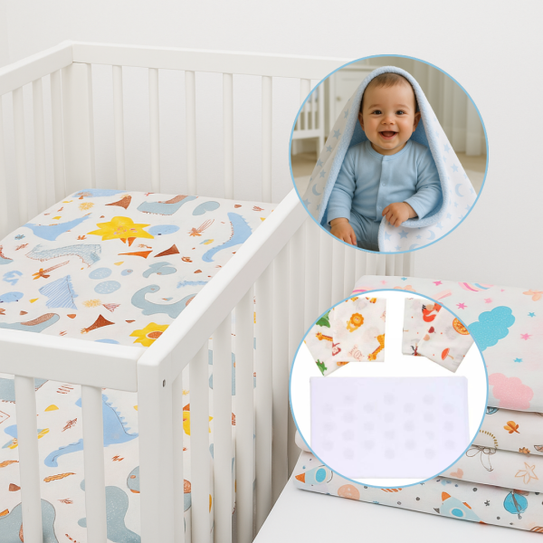 Kit Enxoval Completo 8 Peças 100% Algodão – Lençol Berço Padrão Americano com Elástico + Travesseiro Antissufocante + Fronhas + Manta