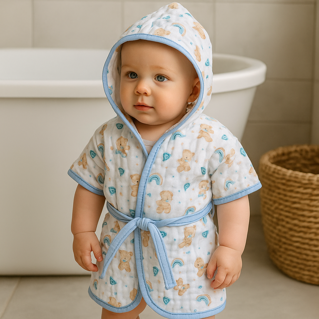 O Roupão de Banho Bebê Soft com Capuz é aquele abraço quentinho depois do banho. Desenvolvido com duas camadas de tecido fralda 100% algodão, ele oferece toque extremamente suave e absorção eficiente, mantendo o bebê seco e confortável em poucos minutos.